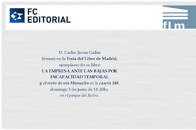 El próximo domingo 3 de junio de 2012, Carlos Javier Galán, abogado de Alberche Área Jurídica, firmará en la Feria del Libro de Madrid ejemplares del reciente volumen colectivo que ha coordinado, La empresa ante las bajas por incapacidad temporal, así como de sus anteriores obras, a invitación de FC Editorial, sello que ha publicado sus libros de divulgación jurídica. El autor estará en la caseta de FC Editorial, la número 140 de la Feria ubicada en el Parque del Retiro, de 18 a 20 horas.