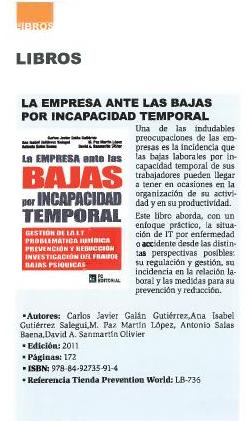 Bajas laboralesCarlos Javier GalánLa empresa ante las bajas por incapacidad temporalLibrosPrevention World MagazinePublicaciones